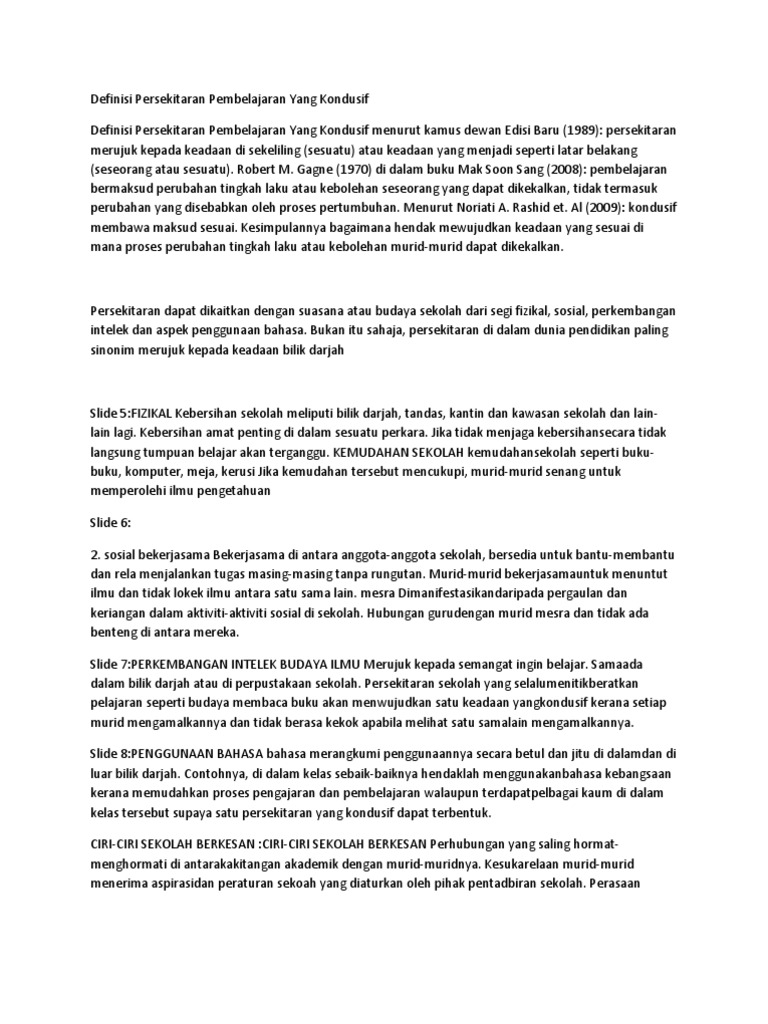 Bagaimanakah cara seseorang guru membentuk suasana yang kondusif dalam mengendalikan aktiviti pengajaran dan pembelajaran ? 1.1 konsep persekitaran bilik darjah yang kondusif persekitaran pembelajaran yang kondusif ialah tempat murid pengurusan bilik darjah yang cekap mewujudkan suasana pembelajaran yang harmoni. Selain strategi pembelajaran yang menyenangkan, pendidik harus menciptakan suasana pembelajaran yang kondusif. Siswa juga diajak berani bertanya untuk kepentingan proses belajar mengajar dalam kehidupan bermasyarakat. Lokasi sekolah yang berada terlalu dekat dengan keramaian, seperti;